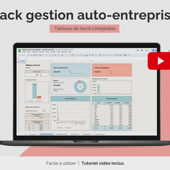 Gérer une auto-entreprise demande de l'organisation et des outils performants. Avec le pack tableau de bord gestion auto-entreprise, accédez à un ensemble de fichiers optimisés pour simplifier la gestion de votre activité. Ce pack tout-en-un inclut un tableau de bord comptable, un outil de gestion et suivi des stocks, un suivi de facturation et un calendrier mensuel.