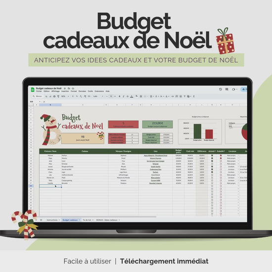 Le tableau calcule automatiquement les jours restants avant NoĂ«l, le nombre de cadeaux encore Ă acheter et le budget quâil vous reste.
