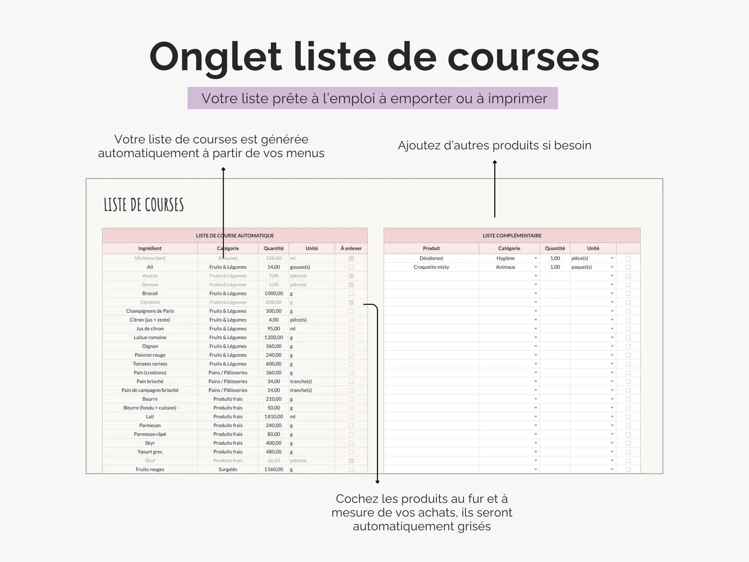 - Gain de temps : liste de courses automatique qui regroupe vos ingrédients par rayons et additionne les quantités